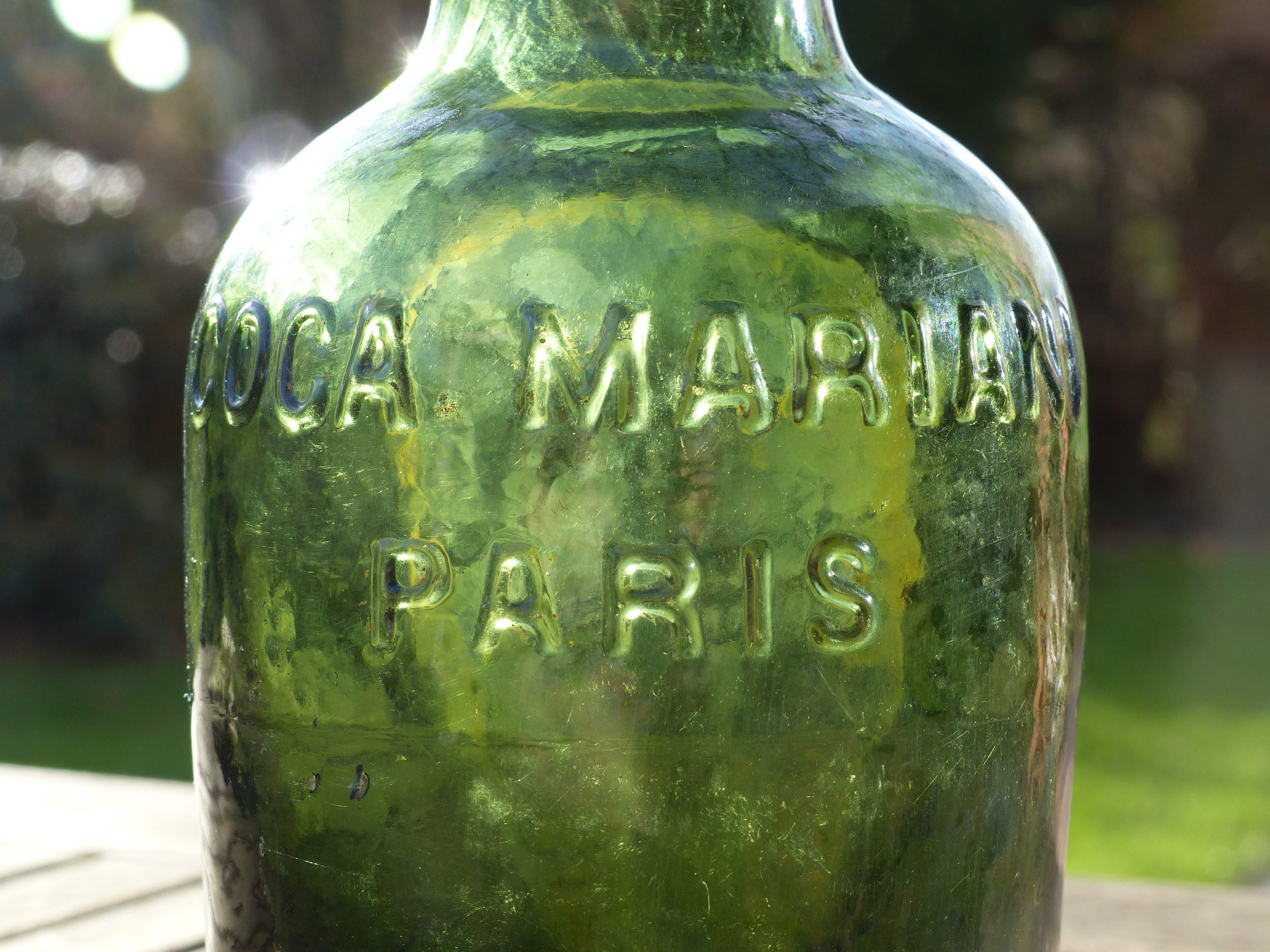Here is a somewhat “modern” bottle for my blog, as it dates from the late 19thC., probably around 1880. It is a bottle of Coca Mariani, a tonic drink invented in 1863 by Angelo Mariani, a Corsican chemist and pharmacist and composed of Bordeaux wine and extract of coca leaves. The Mariani wine thus contained about 6-7 mg of cocaine per bottle and was a great commercial success. The fortifying drink was however banned in 1910, few years before wormwood (1914-1915). The Mariani wine is sometimes regarded as the ancestor of the American Coca-Cola.