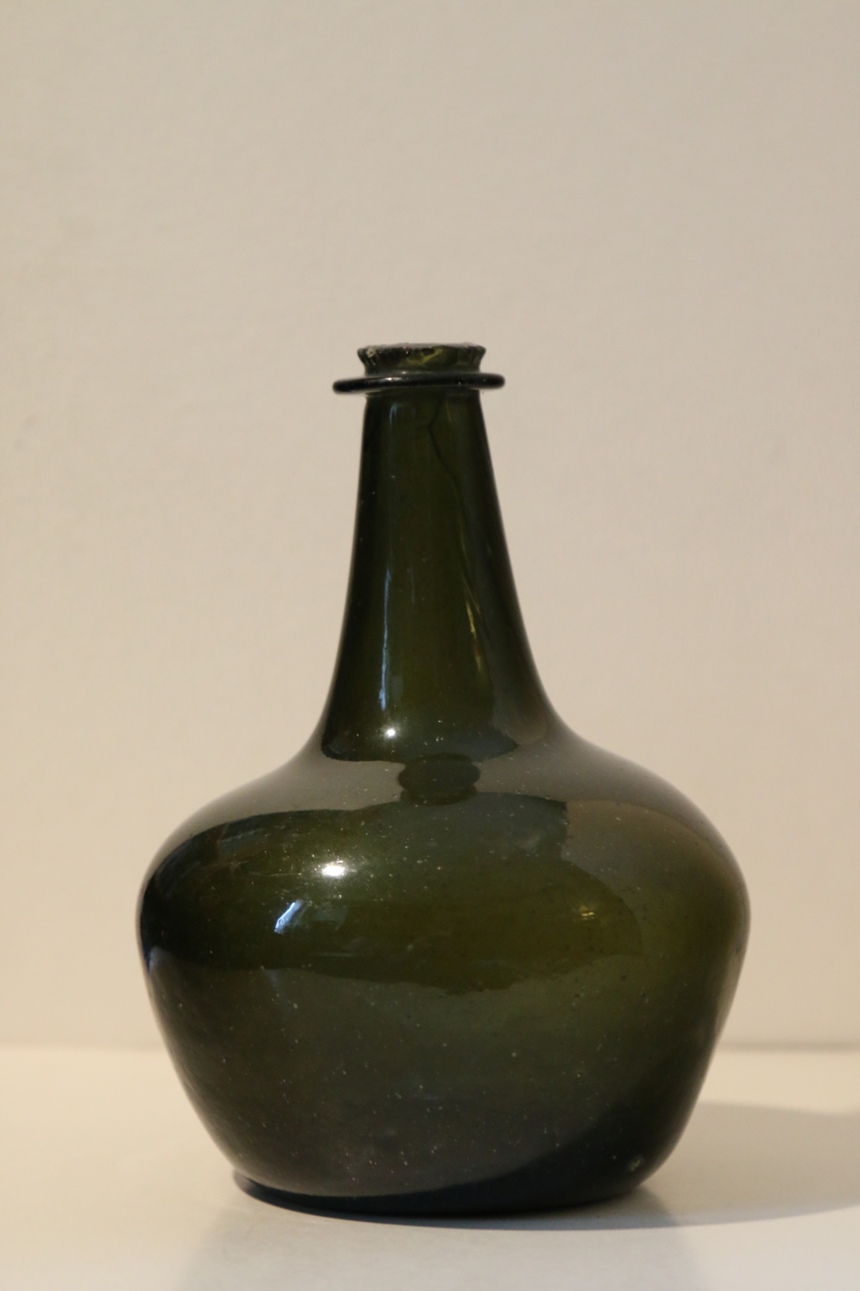 Rare in France, the shape of this English bottle is known as « shaft and globe ». The bottle is 20 cm in height and weighs 907 grams. It is blown in a relatively light green glass compared to the « black » glass of most English bottles and in particular mallets (mallets) and cylinders. The mouth has many nicks left by the devastating use of a straight corkscrew. The string ring is a protruding flat ring whose periphery exhibits wear marks; I illustrate a second, very similar string rim in a bottle fragment recovered from dredged remains in the River Thames. The push-up is characterized by the presence of a sharp disc-shaped mark and a central « nipple » of broken glass. This scar differs from the typical sand pontil of the 18thC English bottles (see picture and figure from Jones, 1971: whole pdf available in reference section).